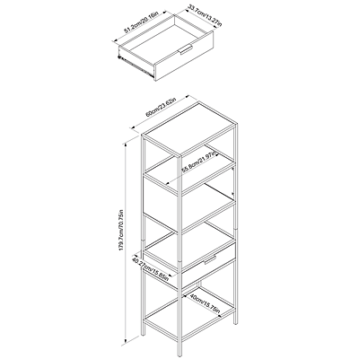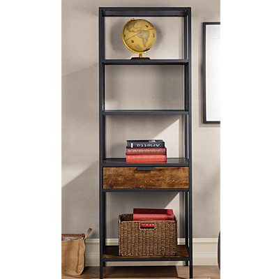 This beautiful display shelving unit is the perfect addition to any room. A lower drawer adds extra storage. The rustic wood look shelves and drawer front perfectly compliment the durable powder coated metal frame.